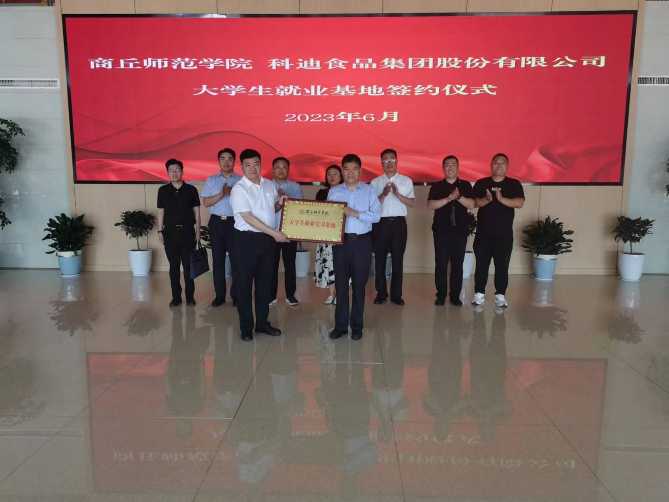 6月9日,科迪食品集團股份有限公司與商丘師范學院舉行“大學生就業基地”簽約儀式。商丘師范學院黨委副書記吳金山、黨政辦公室副主任馬磊、經濟管理學院黨委書記張彤、副書記唐堯崢、投資系主任張時坤,科迪集團黨委書記、董事長李瑞生,黨委委員、副總經理高宇飚,黨委委員、紀委書記趙恰,黨委委員、副總經理范乃超出席簽約儀式。