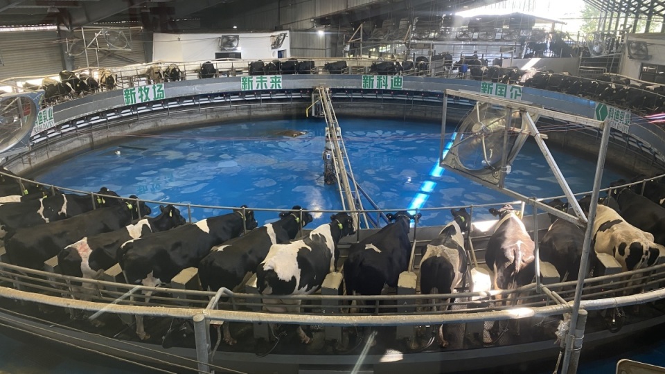 “這個(gè)轉(zhuǎn)盤有80個(gè)擠奶位,每個(gè)位置正好站下一頭牛,牛走上擠奶位后,擠奶設(shè)備會(huì)自動(dòng)與奶牛對(duì)接,自動(dòng)擠奶就正式開始了!”8月29日,在商丘市虞城縣科迪智慧牧場(chǎng),工作人員介紹著擠奶流程。